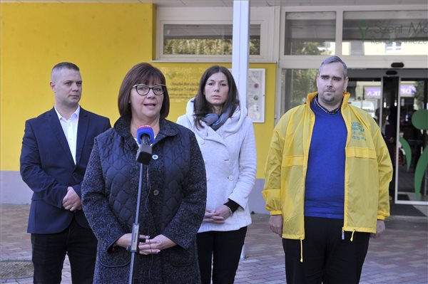 Rózsa László, az ellenzék DK-s óbudai képviselőjelöltje, Gy. Németh Erzsébet, az ellenzék DK-s XVII. kerületi polgármesterjelöltje, Bősz Anett, a Liberálisok országgyűlési képviselője és a szocialista Kiss László, az ellenzék közös III. kerületi polgármesterjelöltje (b-j) az Államilag támogatott, önálló gyermekorvosi szakrendelőt a III. kerületnek! címmel tartott sajtótájékoztatón a Szent Margit Rendelőintézet előtt 2019. október 4-én.